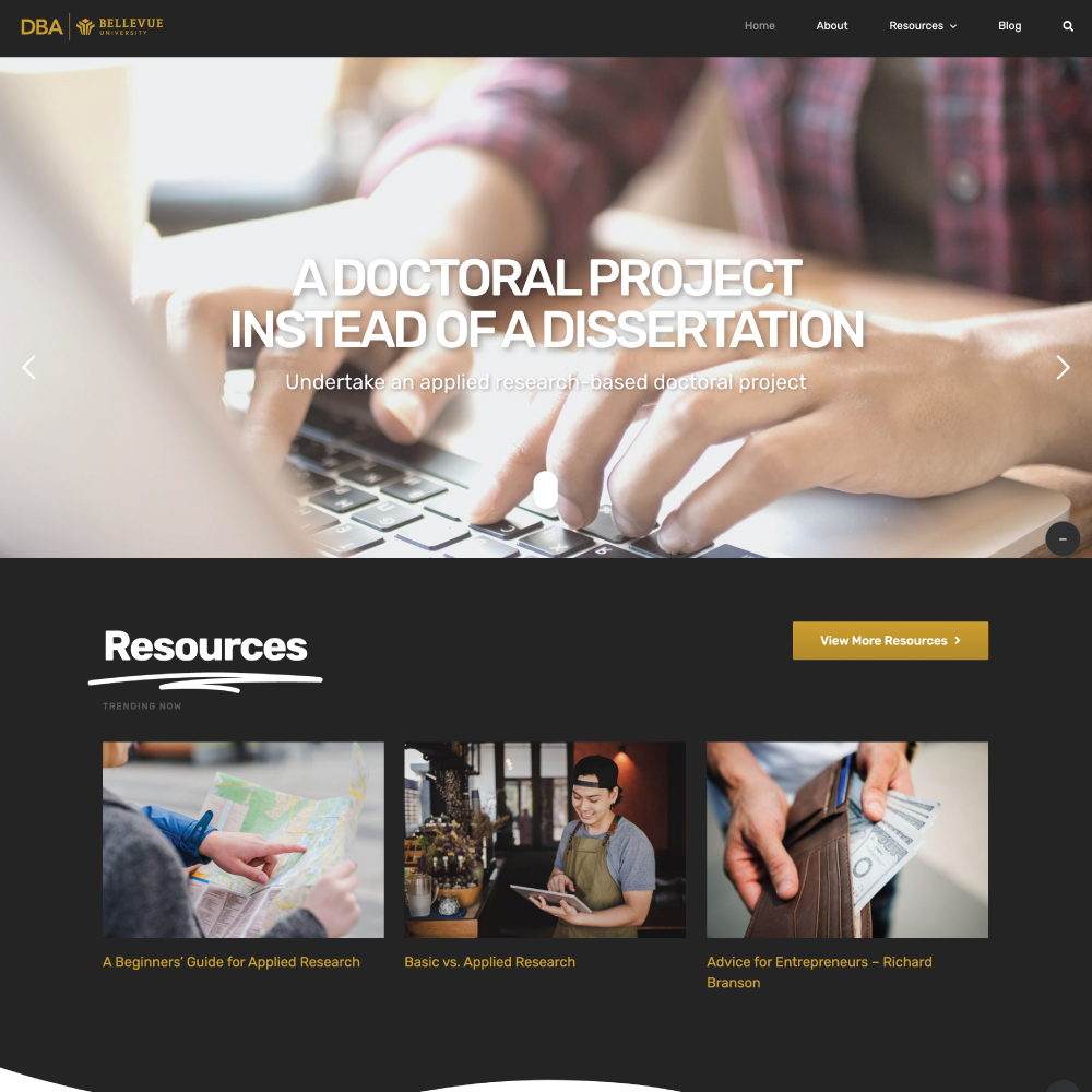 A promotional website for the College of Business Doctorate in Business Administration. The goal of the website is to highlight program strengths and provide resources to current DBA students.